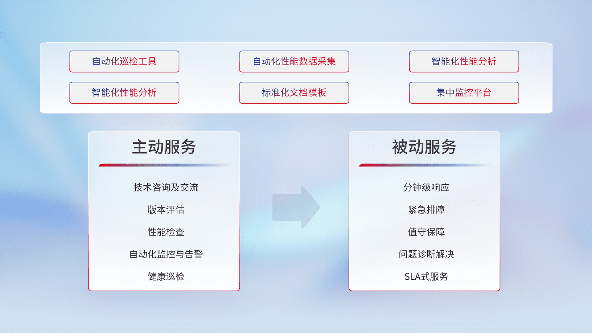 智能化工具和标准化文档,,,保障服务质量,,,,提供主动服务(包含技术咨询、、版本评估、、、、性能检查、、、、自动化监控与告警、、、、健康巡检)和被动服务包含(分钟级响应、、、紧急排障、、、值守保障、、问题诊断解决、、SLA服务)。。。。